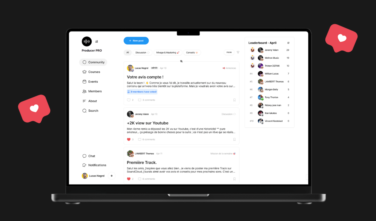 Tu rejoins une communauté de producteurs passionnés, qui ont les mêmes objectifs et les mêmes obstacles que toi. Ici, tu peux partager tes morceaux, recevoir des retours sincères, trouver des idées pour débloquer tes prods, et même collaborer avec d’autres artistes.
